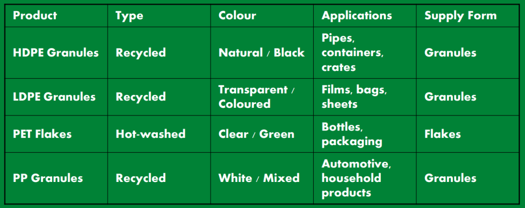 High-strength recycled granules for pipes, containers, and crates.